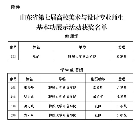 本网讯 近日,由山东省教育厅主办、山东工艺美术学院承办的山东省第七届高校美术与设计专业师生基本功展示大赛结果揭晓。我校美术设计系师生荣获教师组三等奖1项,学生组二等奖1项、三等奖3项,展现出良好的综合素质、专业水平和创新实践能力。